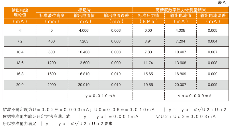 ? ? ? 驗(yàn)證方法依據(jù)JJF1033-2001《計(jì)量標(biāo)準(zhǔn)考核規(guī)范》中規(guī)定的方法用傳遞比較法,用新研制的“液位計(jì)檢定裝置”測(cè)量一穩(wěn)定被測(cè)對(duì)象,然后將該被測(cè)對(duì)象用另一套更高級(jí)的計(jì)量標(biāo)準(zhǔn)進(jìn)行測(cè)量,應(yīng)滿足式∣y-yo∣<√U2+Uo2 的要求。用本所新研制的“液位計(jì)檢定裝置”,選擇的被測(cè)對(duì)象為“壓力式液位計(jì)”,依據(jù)JJG971——2002《液位計(jì)計(jì)量檢定規(guī)程》,用檢定液位的方法對(duì)液位計(jì)進(jìn)行測(cè)試,測(cè)量輸出值最大示值誤差為y=0.010毫安,擴(kuò)展不確定度為U=0.02%(k=2);然后,用本所現(xiàn)有的高精度數(shù)字壓力計(jì),依據(jù)JJG882-94《壓力變送器計(jì)量檢定規(guī)程》,對(duì)同一臺(tái)液位計(jì)用壓力的方法進(jìn)行測(cè)試,測(cè)量輸出值最大示值誤差為yo=0.009毫安,擴(kuò)展不確定度為Uo=0.06%(k=2),比對(duì)結(jié)果見(jiàn)表A